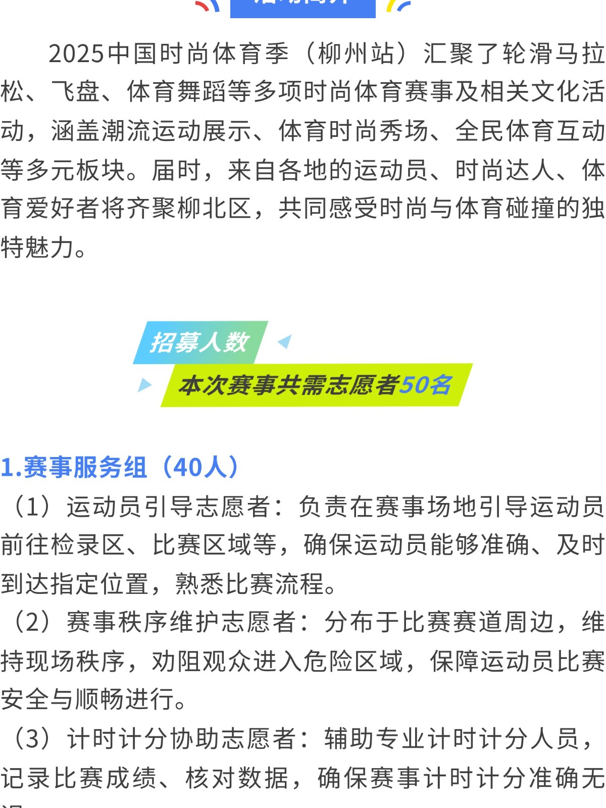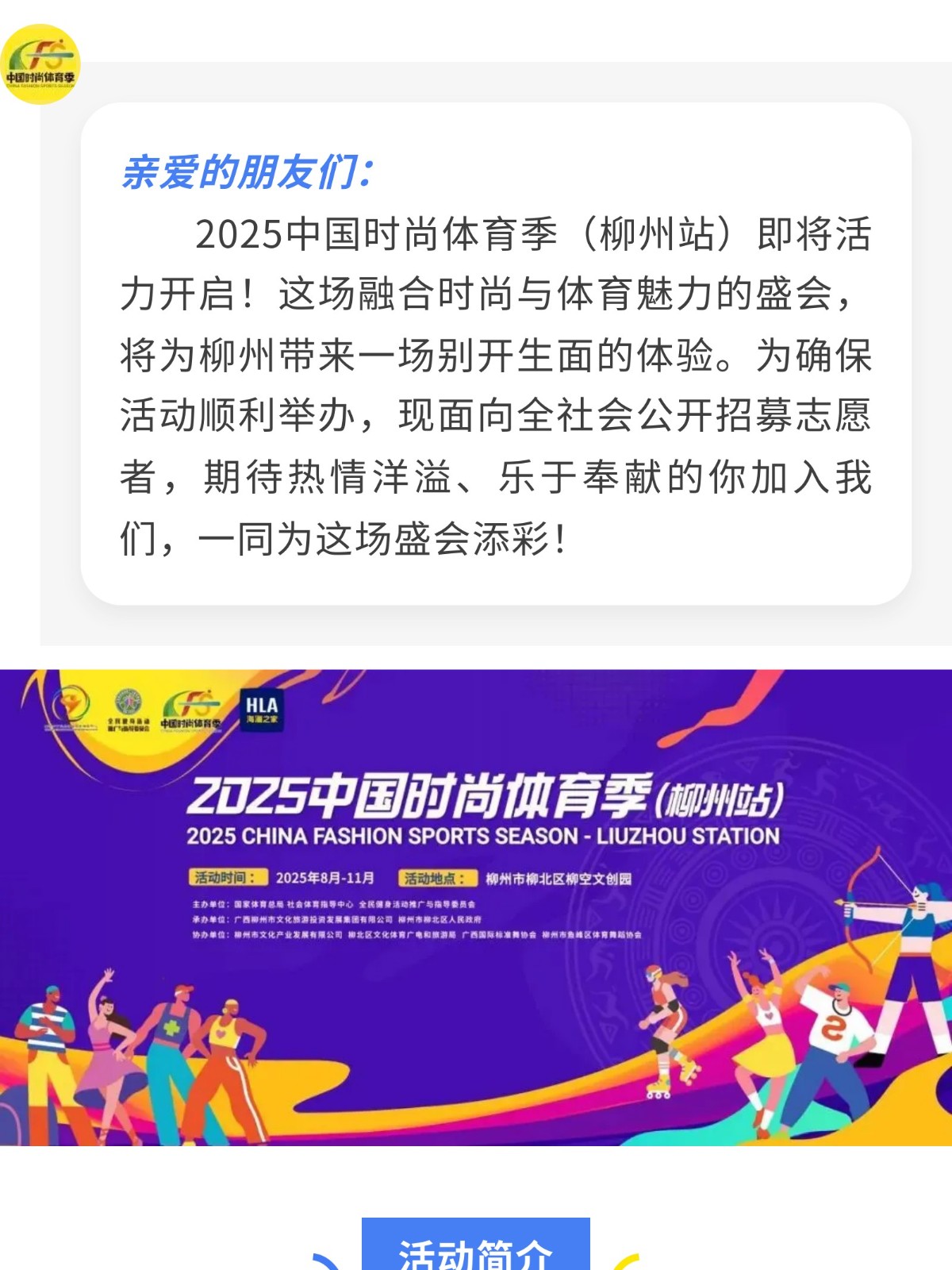 加入我們!2025 中國時(shí)尚體育季(柳州站) 志愿者招募中! 發(fā)布時(shí)間:2025年08月15日 10時(shí)來源:本站原創(chuàng)瀏覽:76 人次