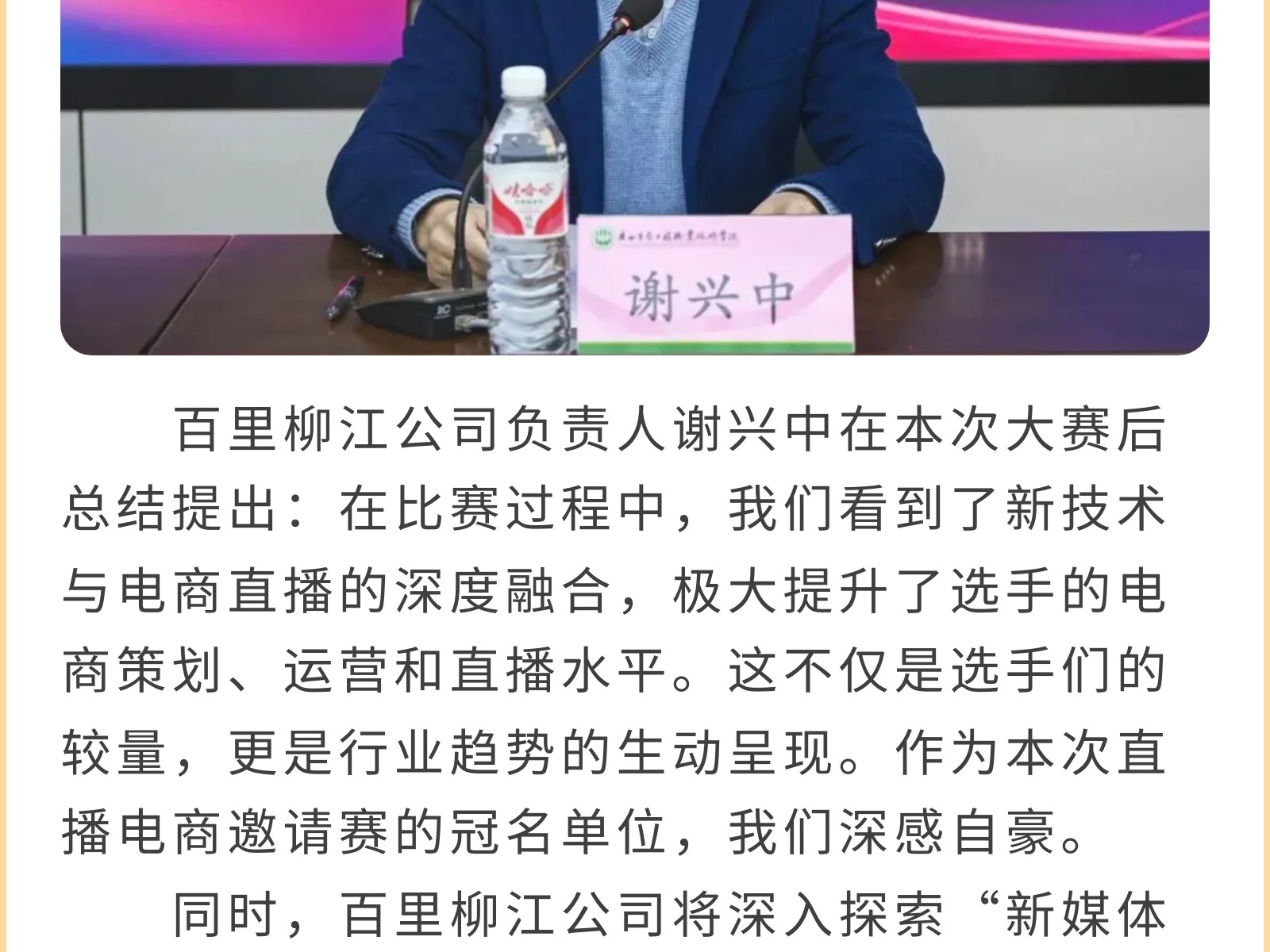 高校聯(lián)合競(jìng)賽,共筑電商夢(mèng)想?——2024年廣西生態(tài)工程職業(yè)技術(shù)學(xué)院柳州文旅“百里柳江杯”直播電商邀請(qǐng)賽圓滿落幕 發(fā)布時(shí)間:2025年01月02日 18時(shí)來源:本站原創(chuàng)瀏覽:240 人次