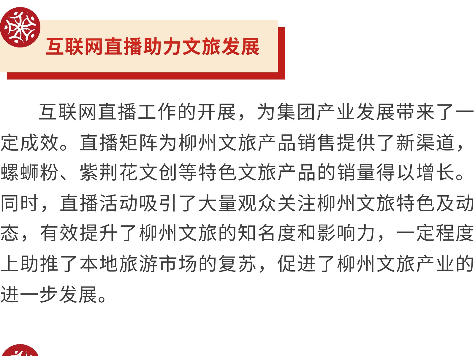 柳州市文旅集團(tuán)積極探索互聯(lián)網(wǎng)直播矩陣,助力城市文旅新發(fā)展 發(fā)布時(shí)間:2025年06月12日 20時(shí)來(lái)源:本站原創(chuàng)瀏覽:185 人次