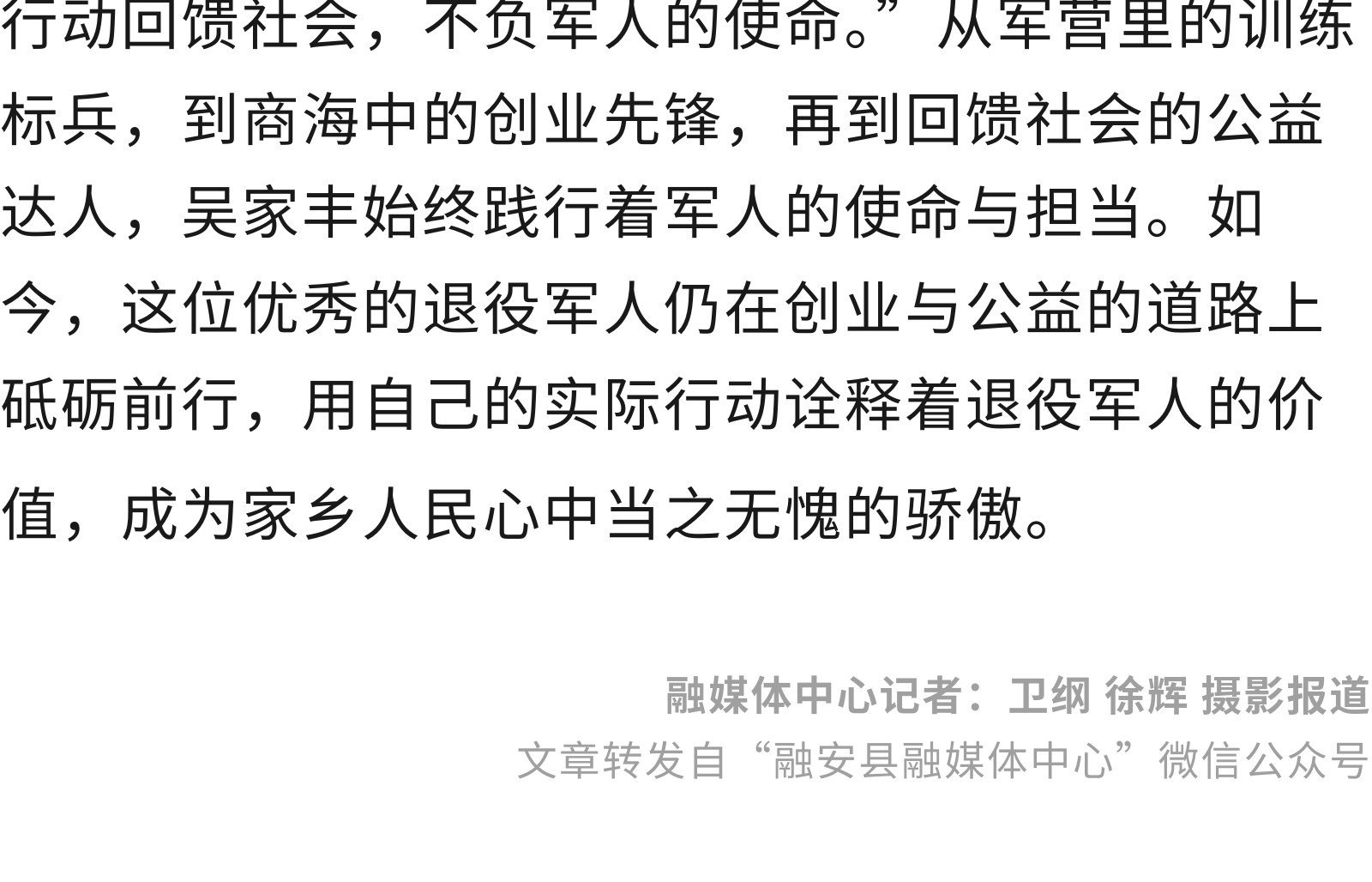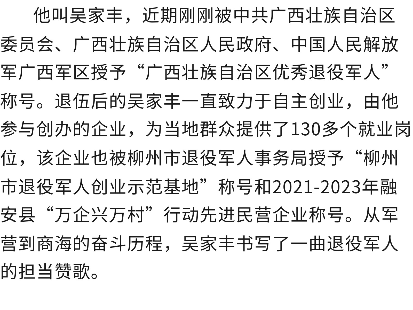 【最美退役軍人】從軍營硬漢到創(chuàng)業(yè)先鋒——記廣西優(yōu)秀退役軍人吳家豐 發(fā)布時間:2025年09月19日 09時來源:本站原創(chuàng)瀏覽:153 人次