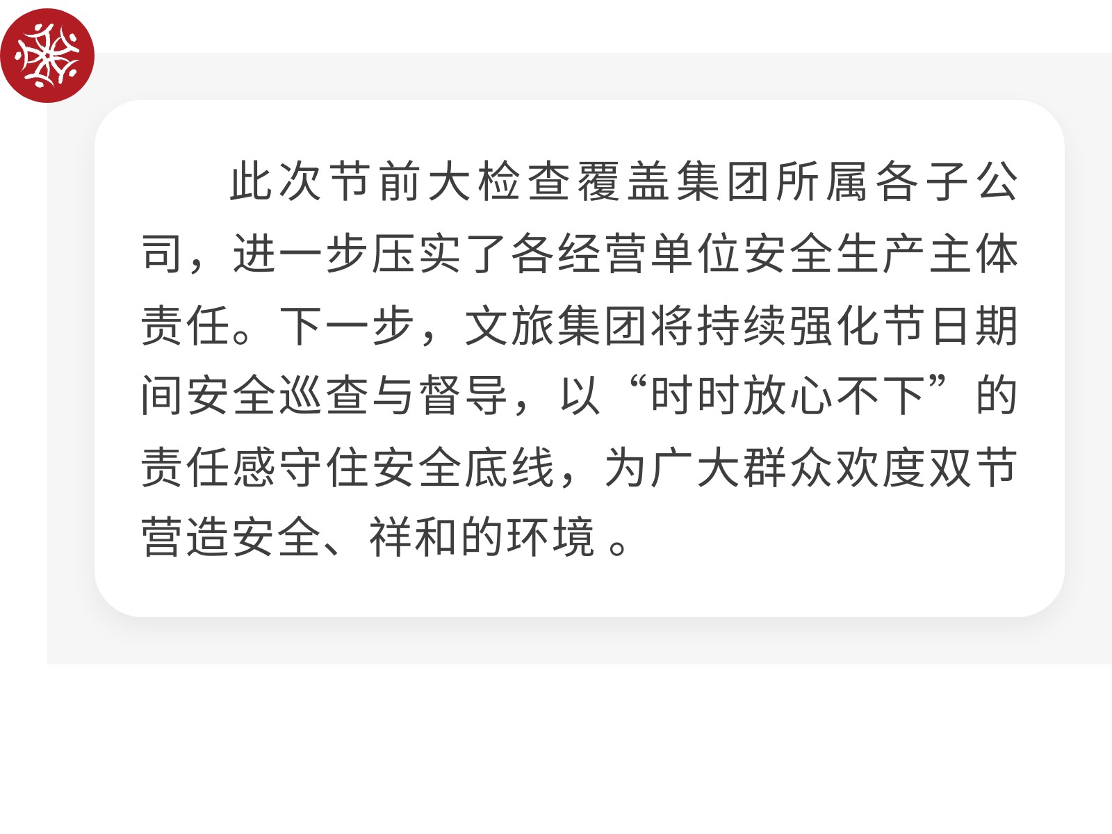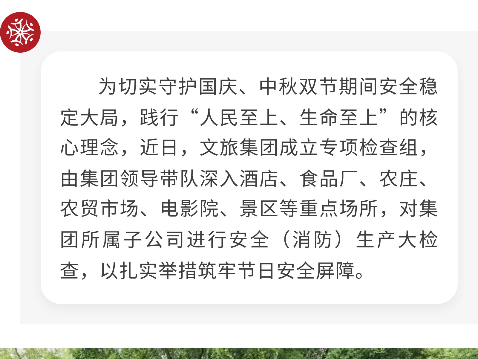 【筑牢安全防線 護航雙節(jié)安寧】文旅集團開展節(jié)前安全(消防)生產大檢查 發(fā)布時間:2025年09月30日 17時來源:本站原創(chuàng)瀏覽:189 人次