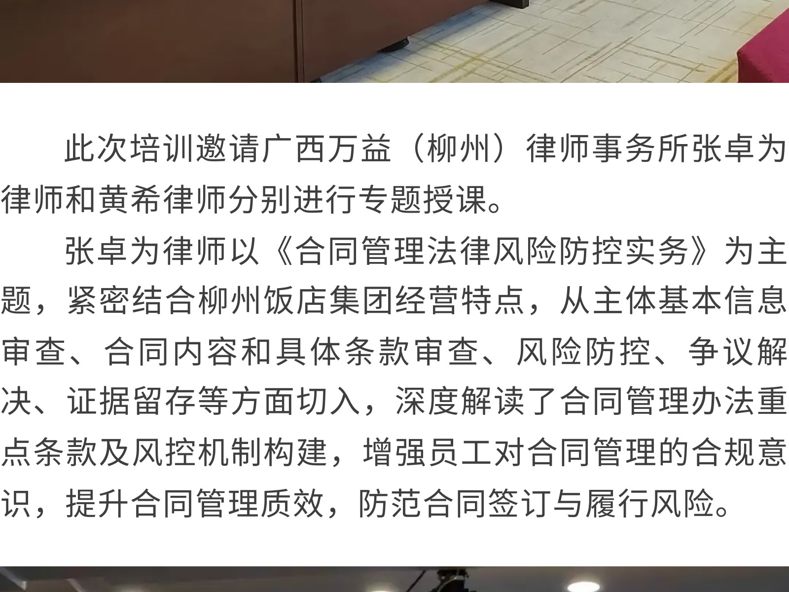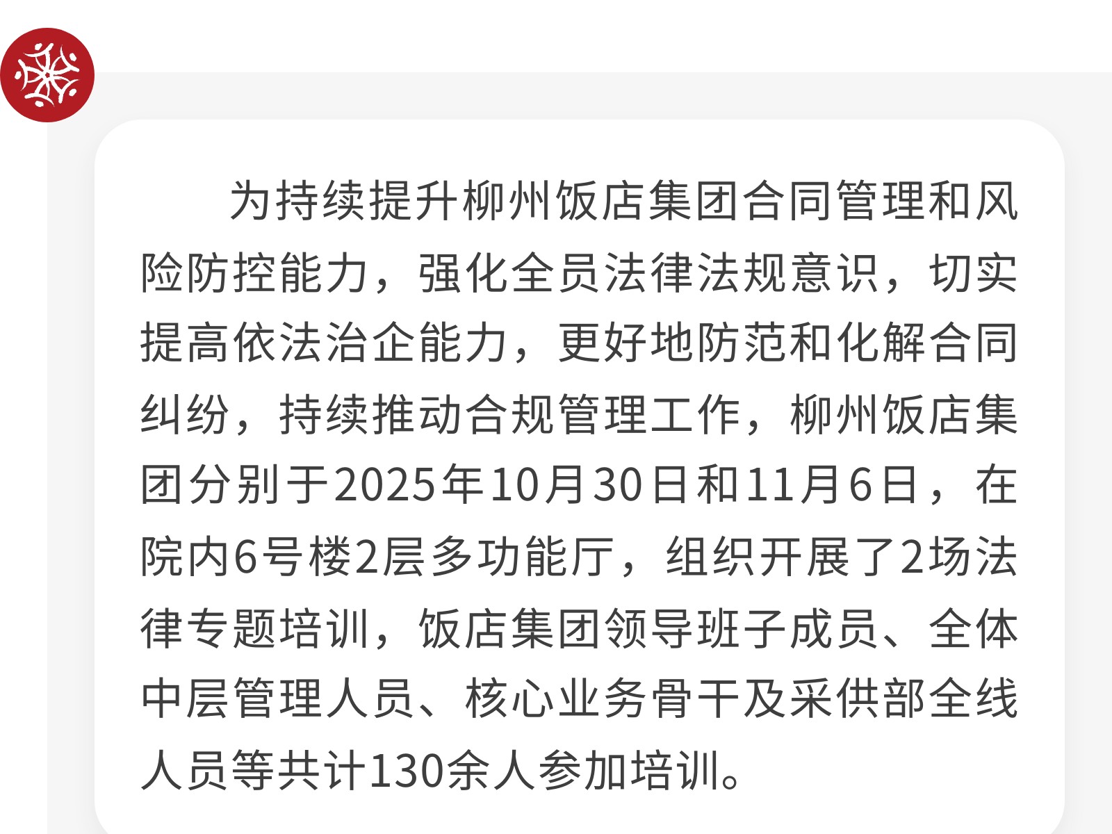 【風(fēng)起于青萍之末,浪成于微瀾之間】柳州飯店集團(tuán)開展法律專題培訓(xùn) 發(fā)布時間:2025年11月13日 15時來源:本站原創(chuàng)瀏覽:73 人次