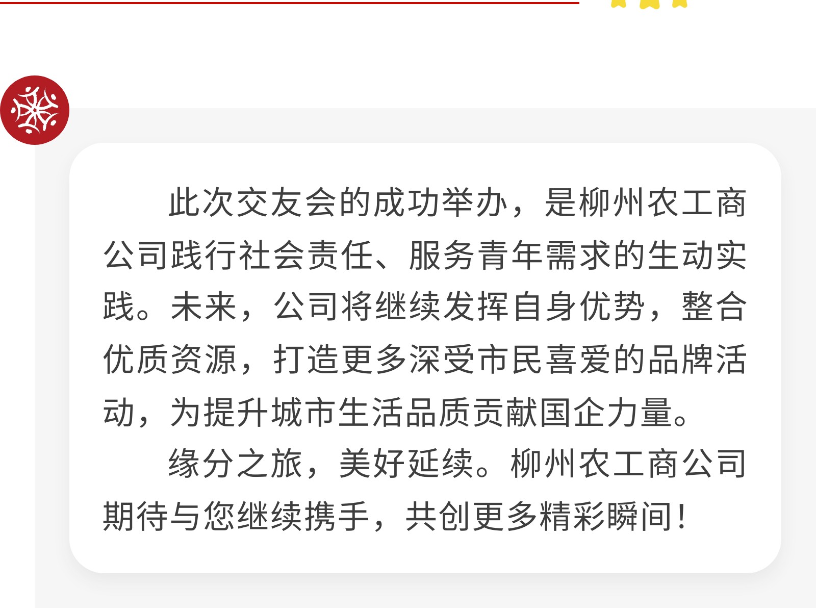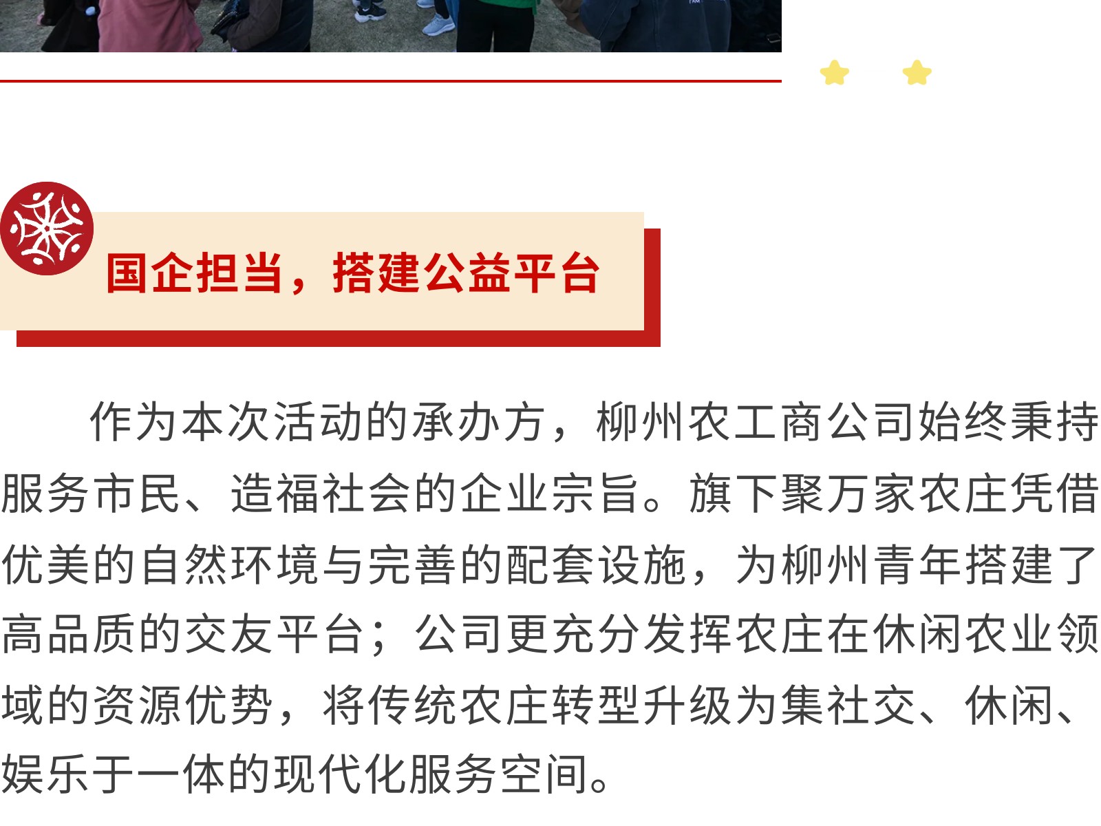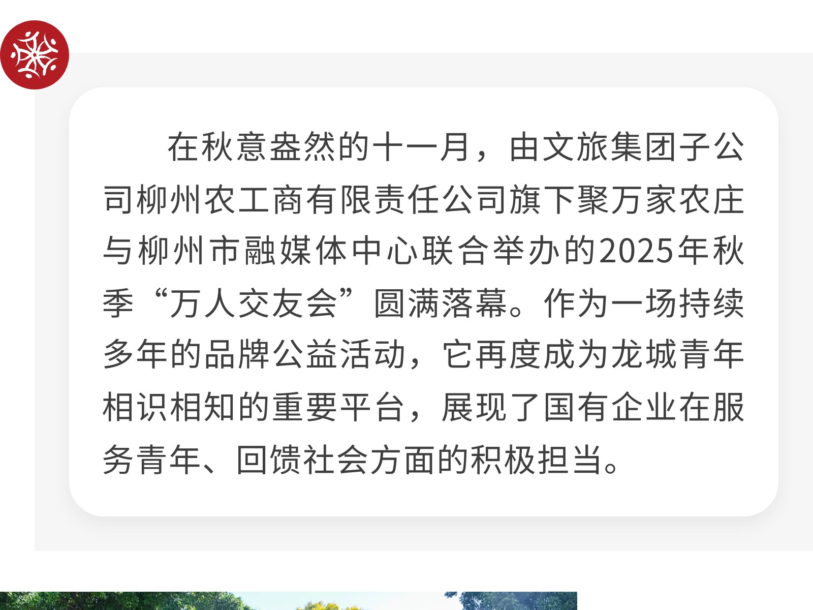 【秋日相約,情聚農(nóng)莊】柳州農(nóng)工商公司攜手打造萬人交友公益盛會 發(fā)布時間:2025年11月25日 16時來源:本站原創(chuàng)瀏覽:89 人次