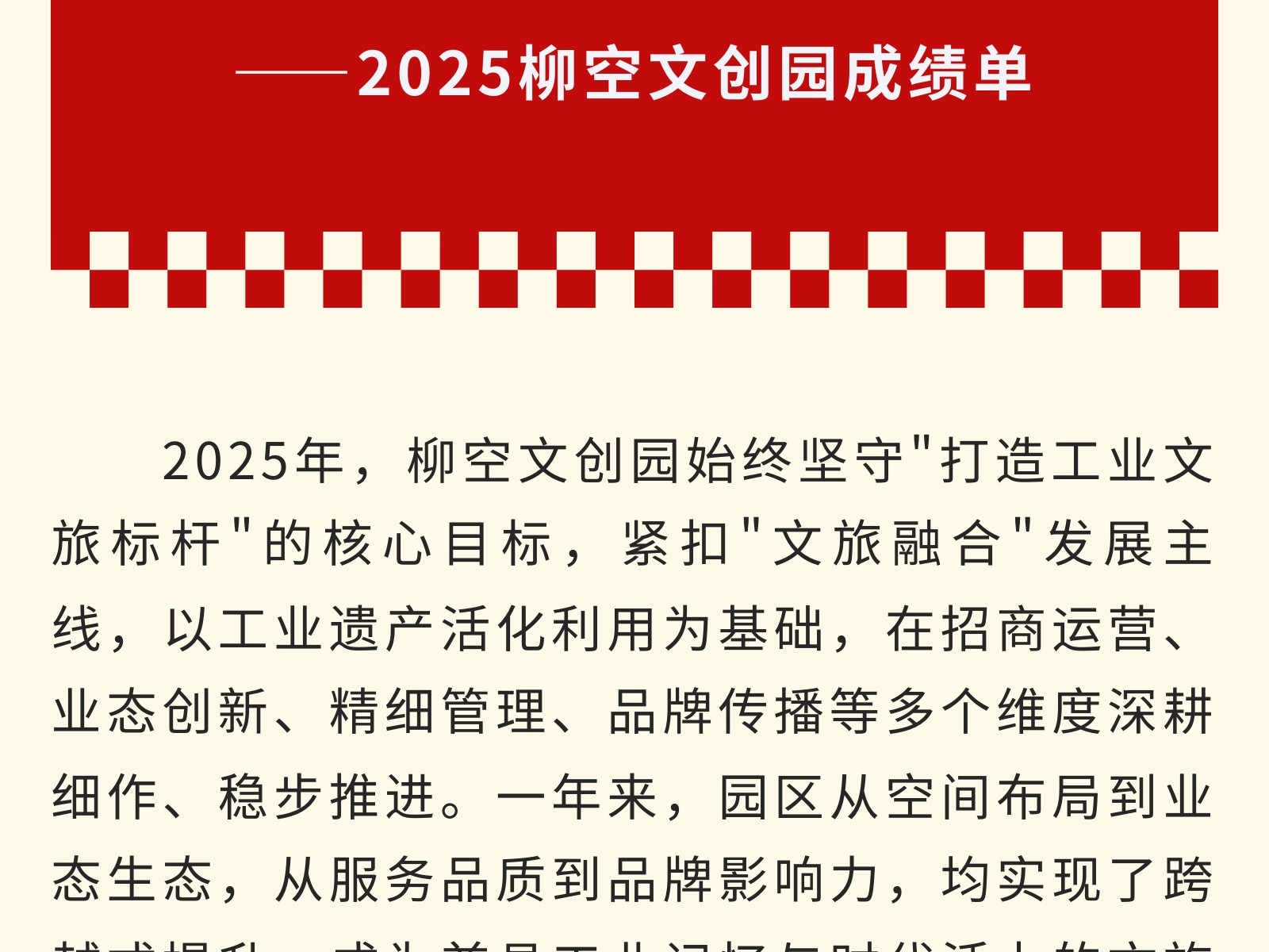 【文旅聚勢(shì)2025】從“鋼鐵廠房”到“網(wǎng)紅打卡地”——2025柳空文創(chuàng)園成績(jī)單 發(fā)布時(shí)間:2026年01月04日 13時(shí)來(lái)源:本站原創(chuàng)瀏覽:25 人次