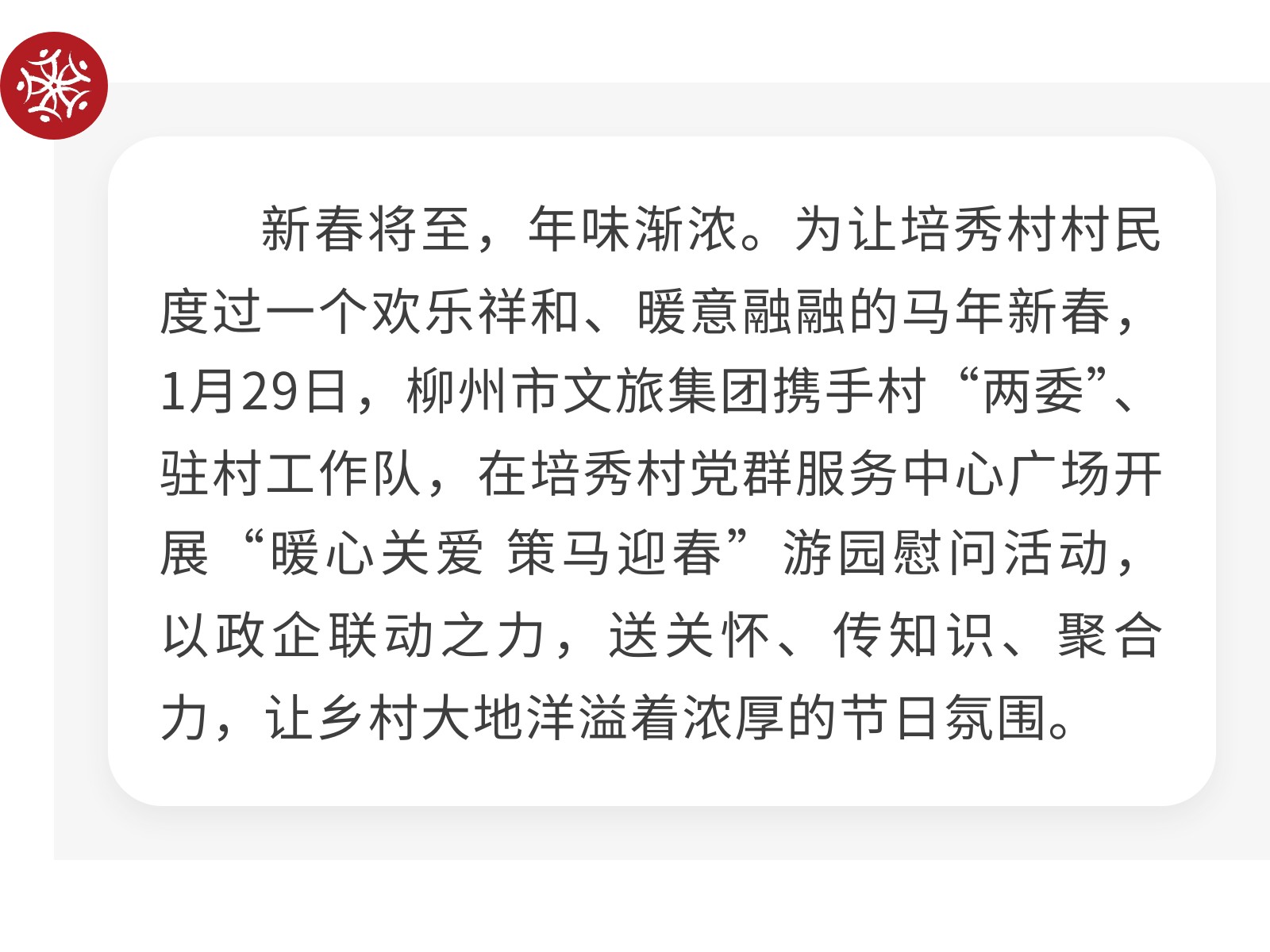 【鄉(xiāng)村振興】聯(lián)動暖新春,鄉(xiāng)村共歡樂——柳州市文旅集團赴培秀村開展慰問及游園活動 發(fā)布時間:2026年02月03日 15時來源:本站原創(chuàng)瀏覽:79 人次
