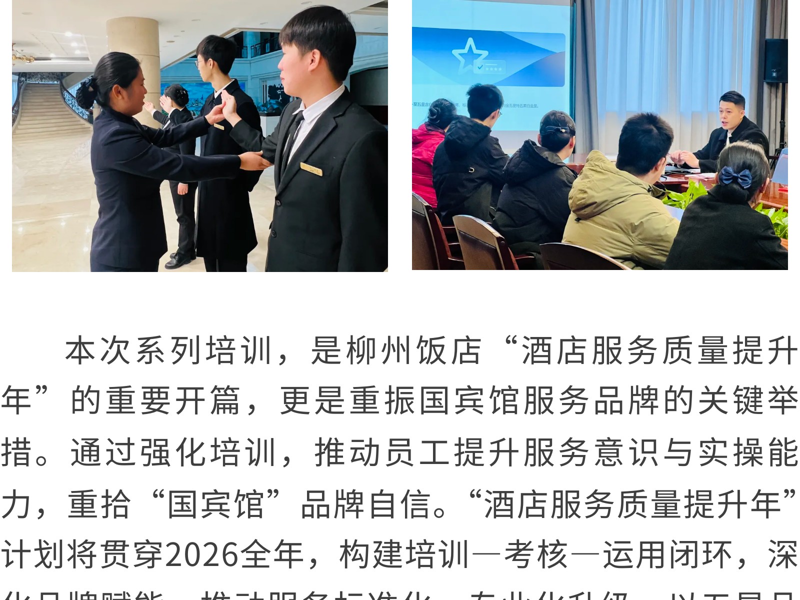 “柳飯學(xué)院”重磅啟班——首期酒店服務(wù)提升班開(kāi)課 以學(xué)促干鑄服務(wù)標(biāo)桿 發(fā)布時(shí)間:2026年02月13日 13時(shí)來(lái)源:本站原創(chuàng)瀏覽:84 人次